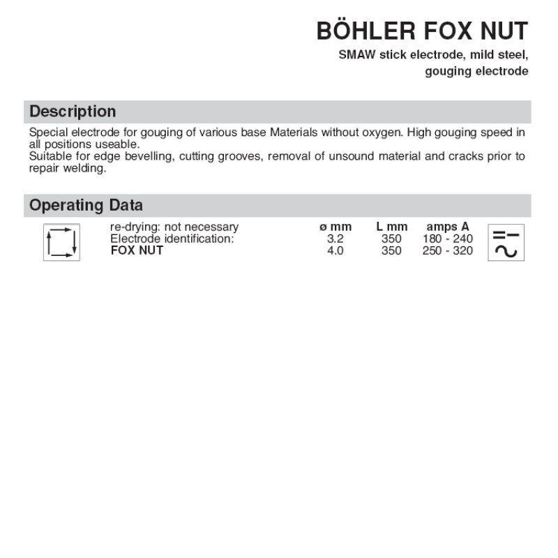 BÖHLER FOX NUT электрод для резки и строжки. Подходит для применения во всех пространственных положениях.