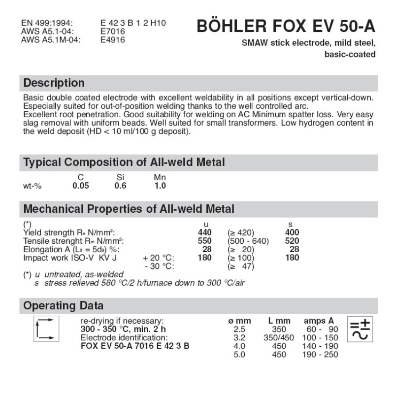 BÖHLER FOX EV 50-A сварочный электрод с основным покрытием. Подходит для применения во всех пространственных положениях, кроме вертикально сверху вниз.