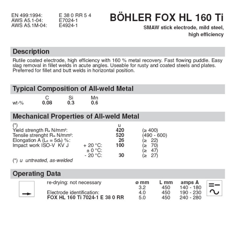 BÖHLER FOX HL 160 Ti сварочный электрод с рутиловым покрытием. Подходит для применения в горизонтальном нижнем положении.