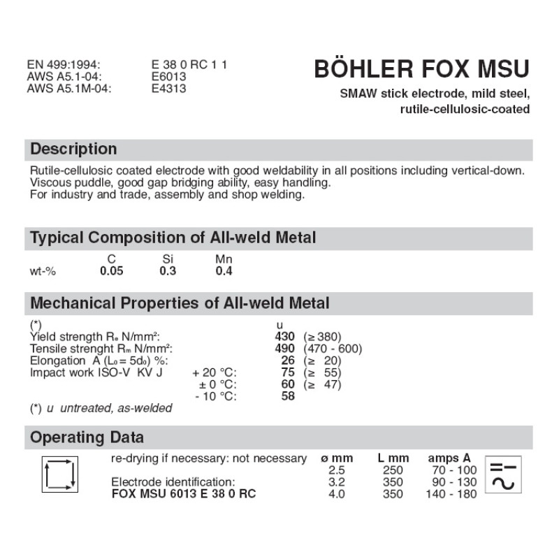 BÖHLER FOX MSU сварочный электрод с рутилово-целлюлозным покрытием. Подходит для применения во всех пространственных положениях.
