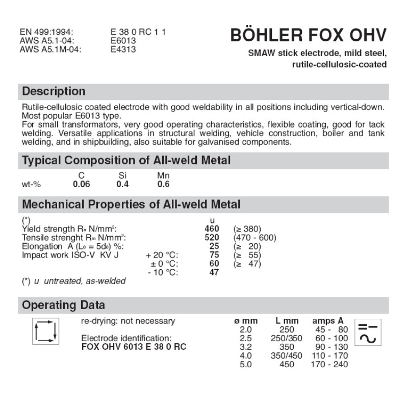 BÖHLER FOX OHV сварочный электрод с рутилово-целлюлозным покрытием. Подходит для применения во всех пространственных положениях.